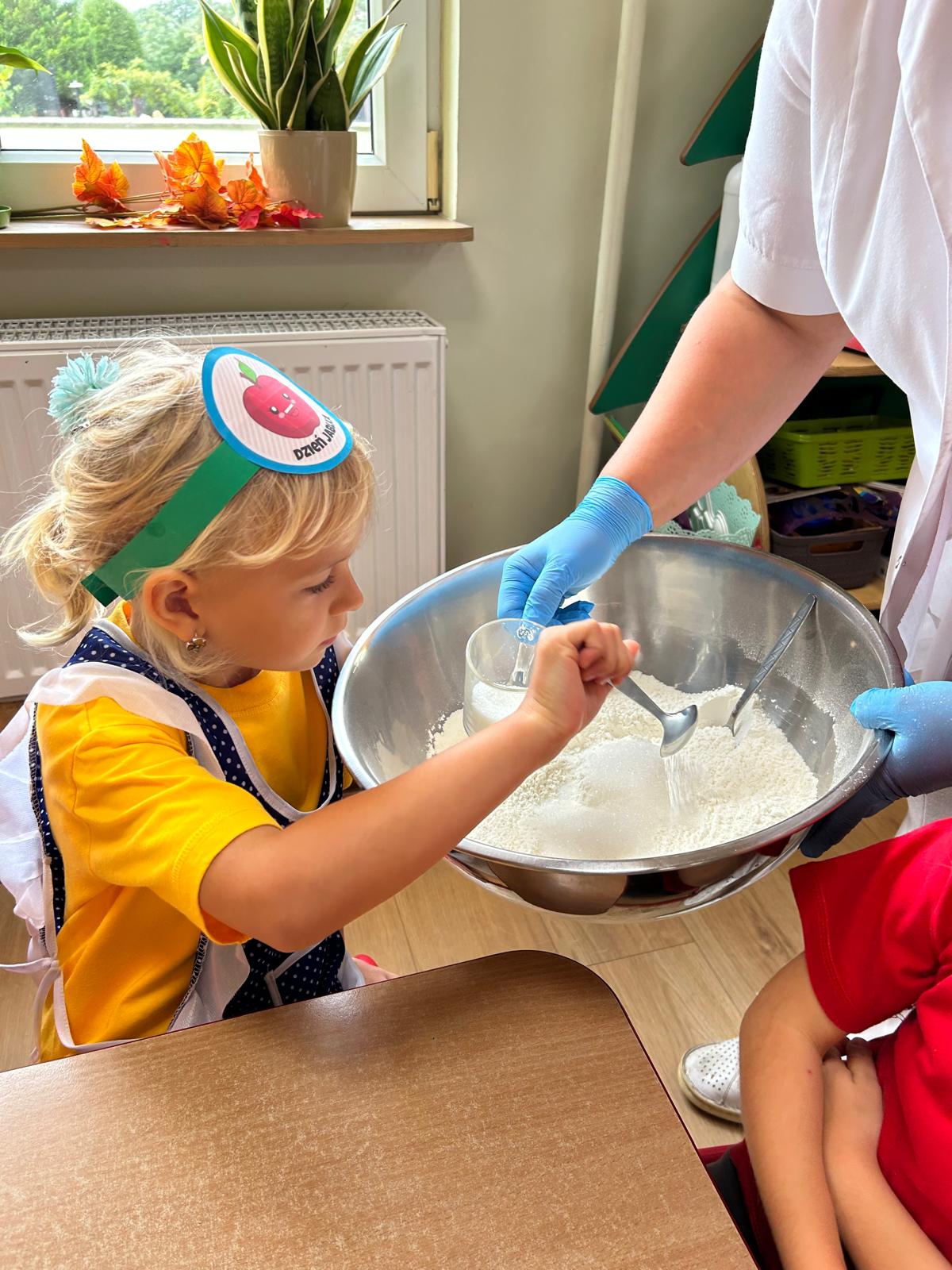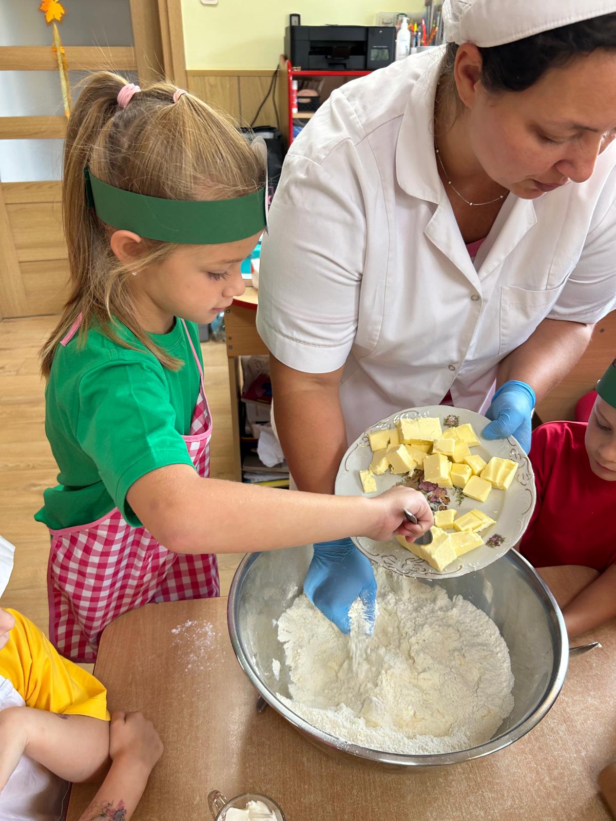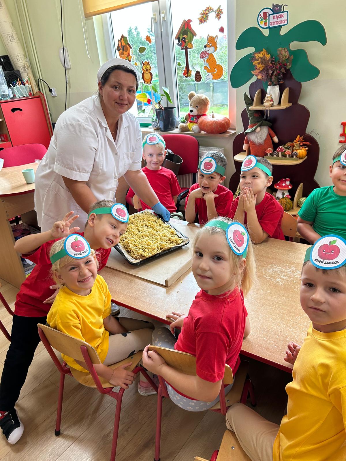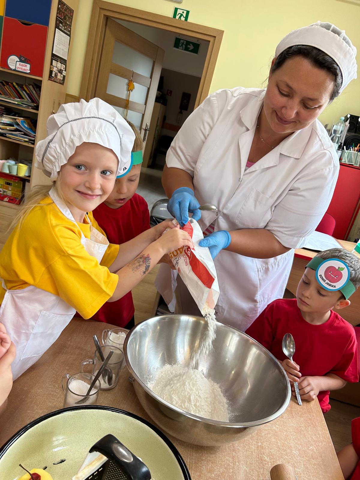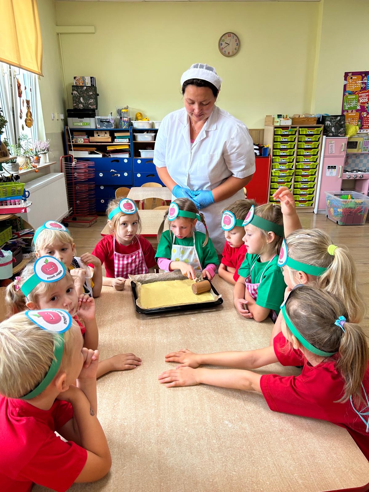 Tymczasem grupa Kotki piekła pyszną szarlotkę, a w przygotowaniach pomagała im Pani Terenia, nasza przedszkolna kucharka. Dzieci razem z Panią Terenią mieszały składniki i obserwowały, jak jabłka i cynamon zamieniają się w aromatyczne ciasto.