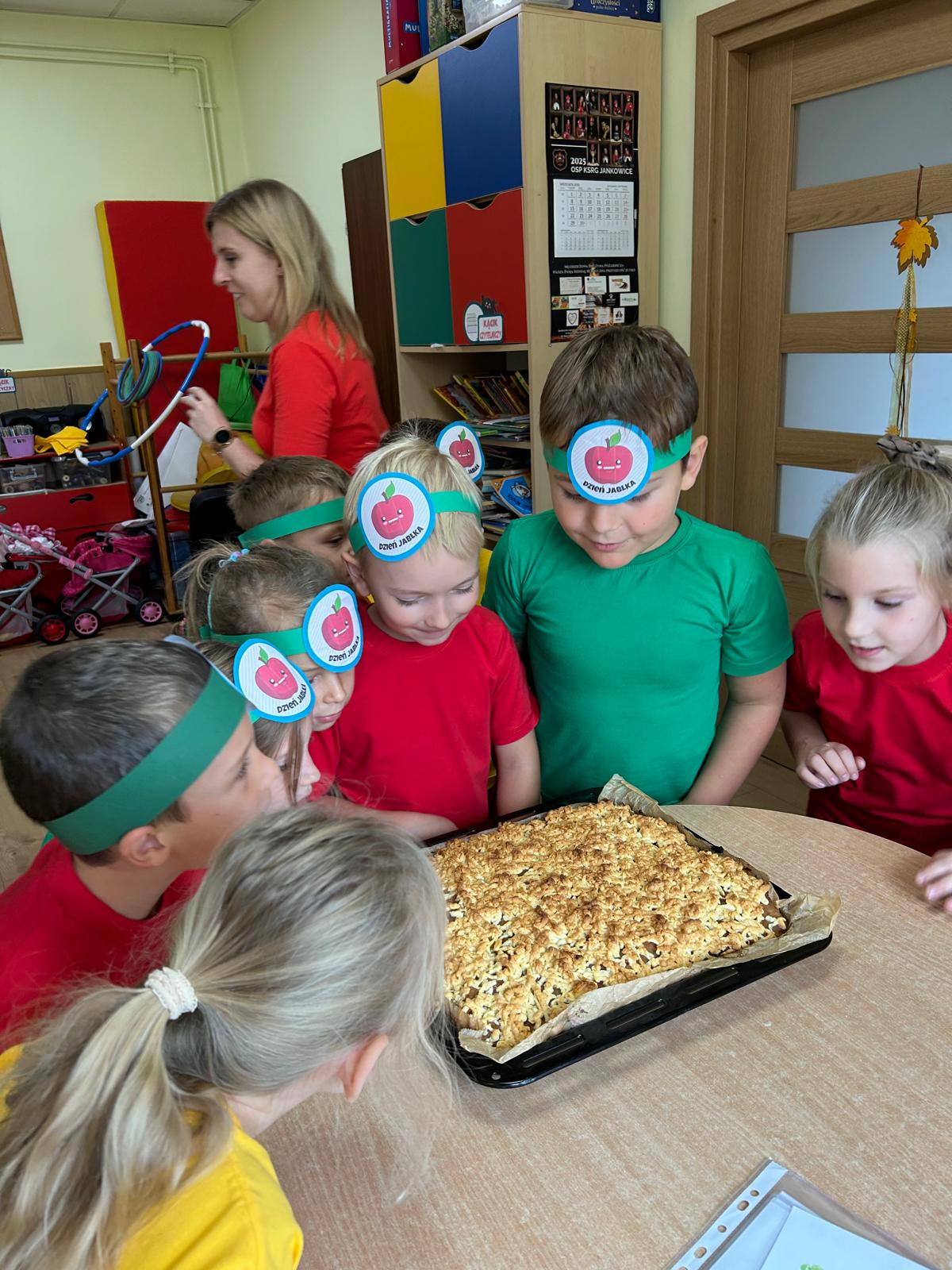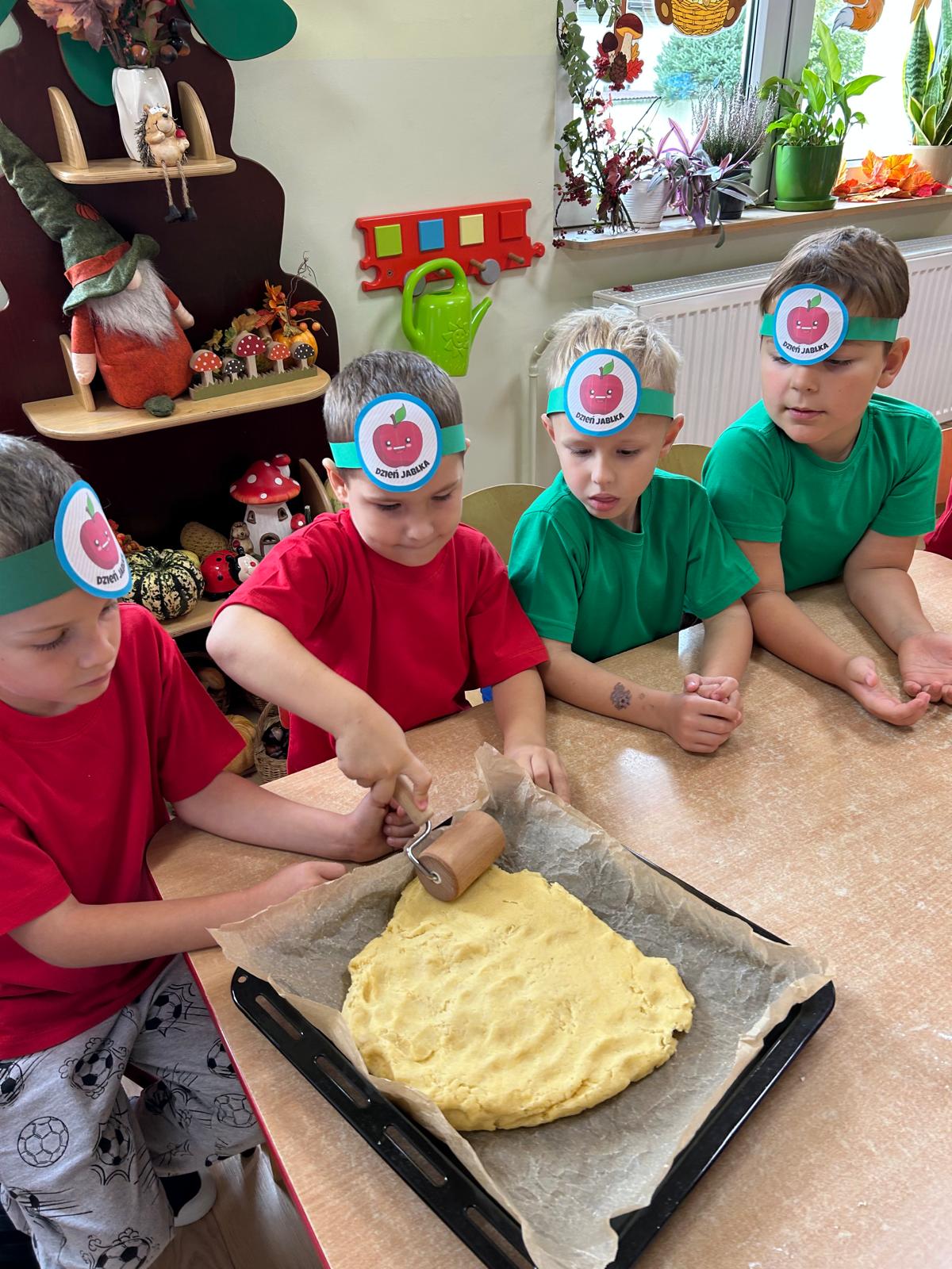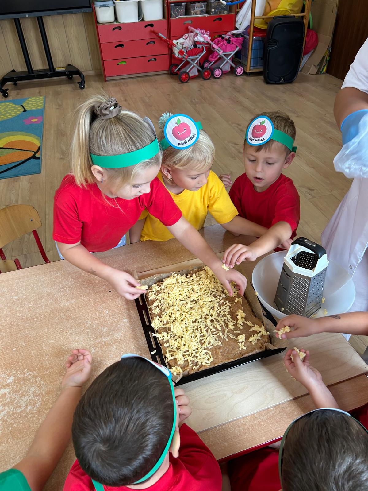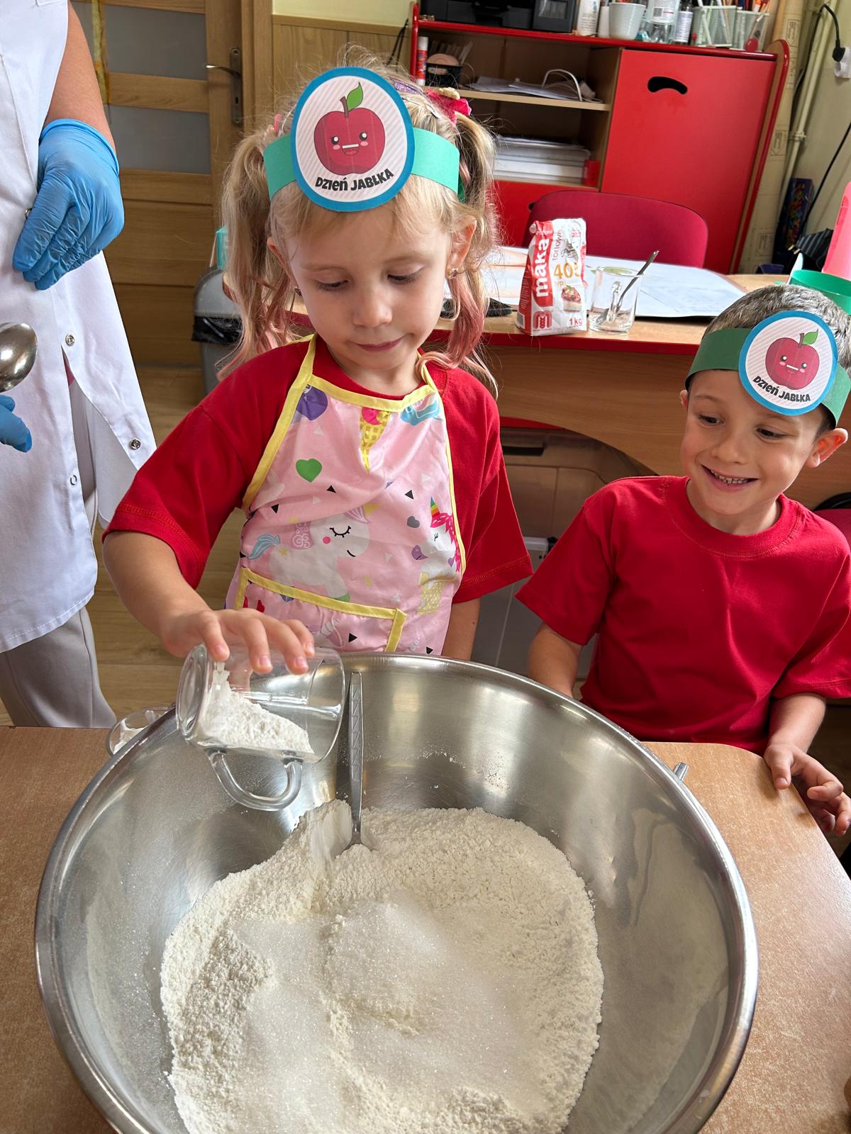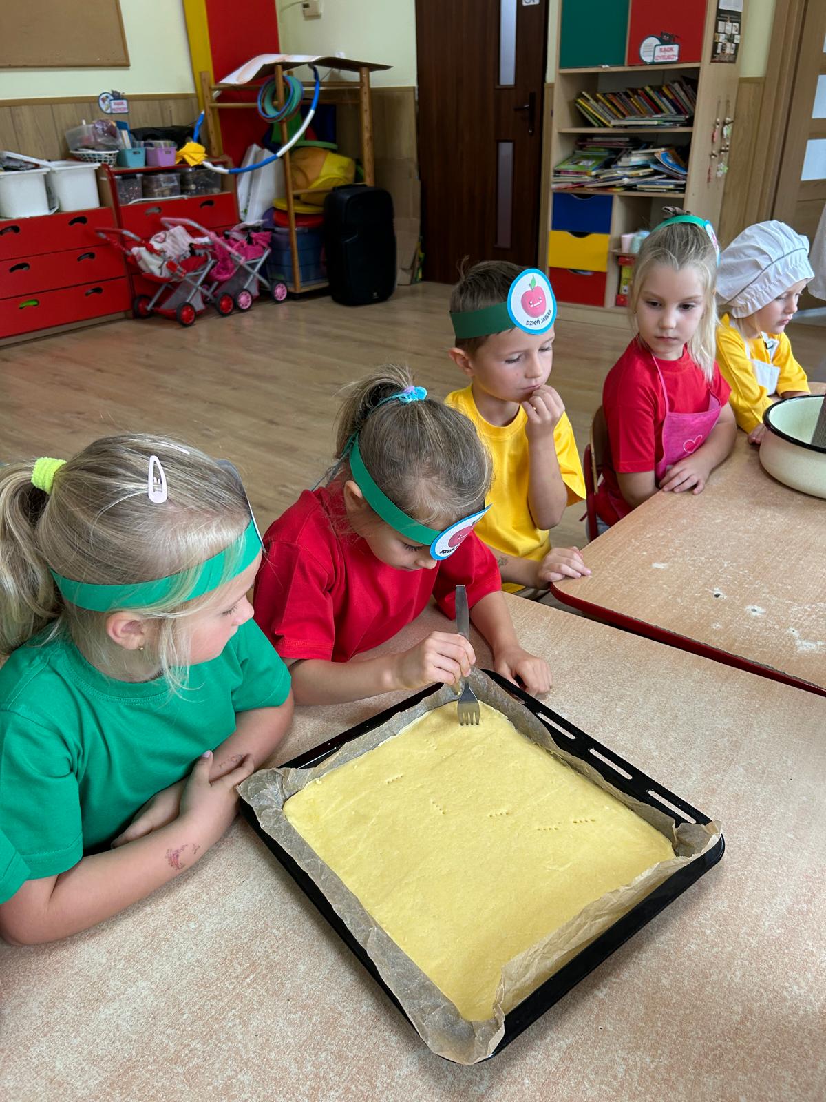 Tymczasem grupa Kotki piekła pyszną szarlotkę, a w przygotowaniach pomagała im Pani Terenia, nasza przedszkolna kucharka. Dzieci razem z Panią Terenią mieszały składniki i obserwowały, jak jabłka i cynamon zamieniają się w aromatyczne ciasto.