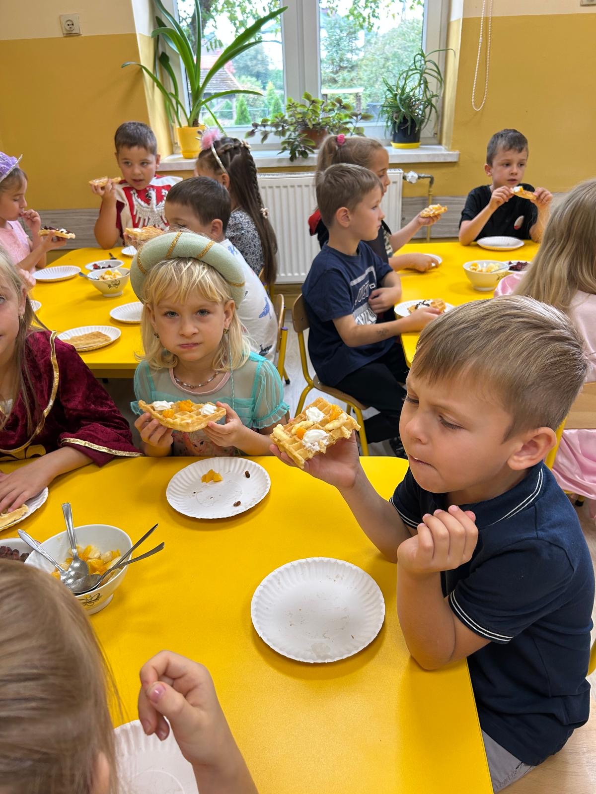 Po emocjonujących zmaganiach wszyscy zasiedli do słodkiej uczty – pyszne gofry były prawdziwą nagrodą dla naszych małych bohaterów! 🍓🧇