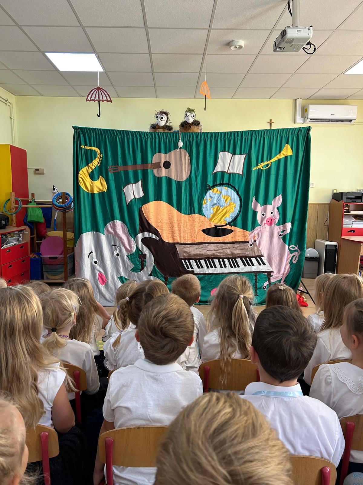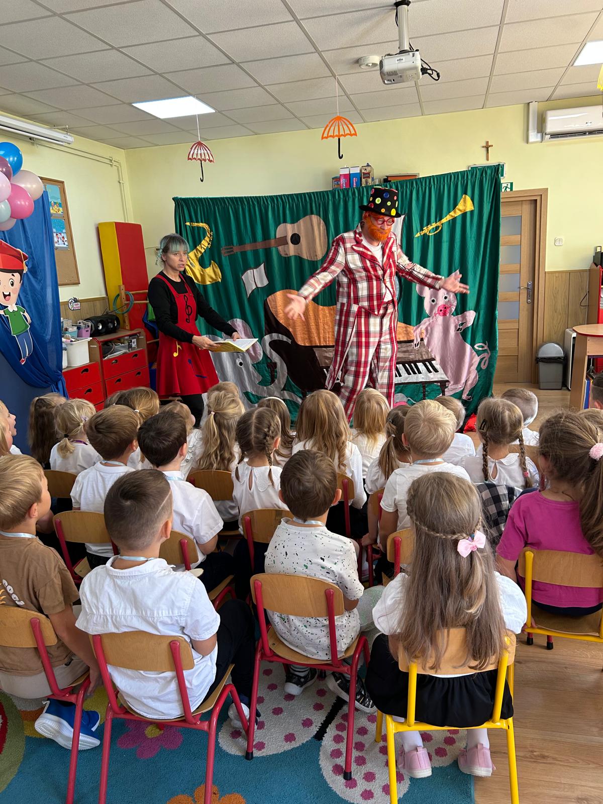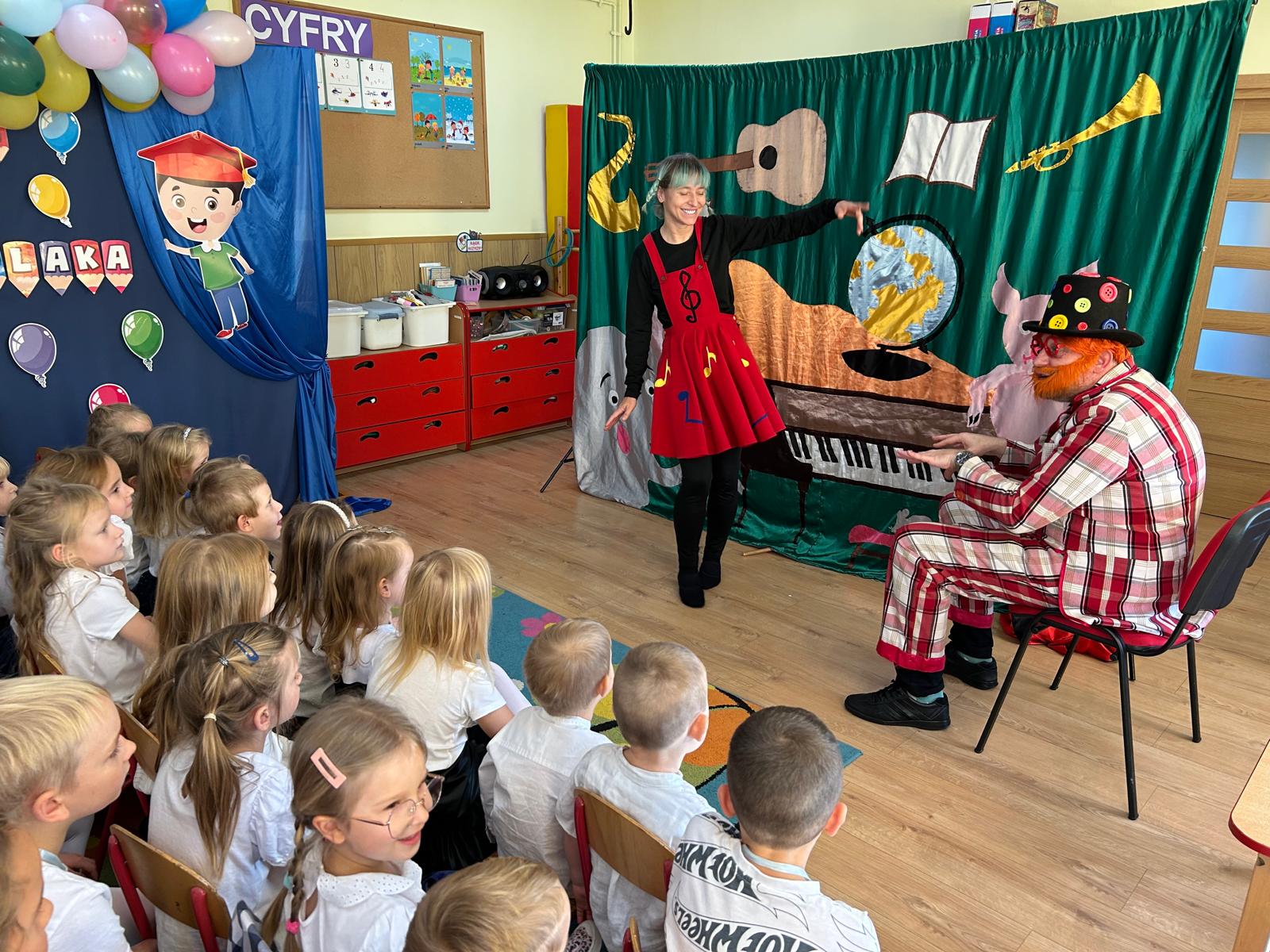Dziś nasze przedszkole odwiedził teatrzyk „Skrzat”, który zaprezentował dzieciom wspaniały spektakl pt. „Muzyczne podróże po Bajkolandii”. Przedszkolaki z ogromnym zainteresowaniem śledziły przygody bajkowych bohaterów, aktywnie uczestnicząc w muzycznych zabawach i śpiewie. Występ dostarczył wszystkim wiele radości, a kolorowe stroje i wesołe piosenki wprowadziły dzieci w magiczny, bajkowy nastrój.