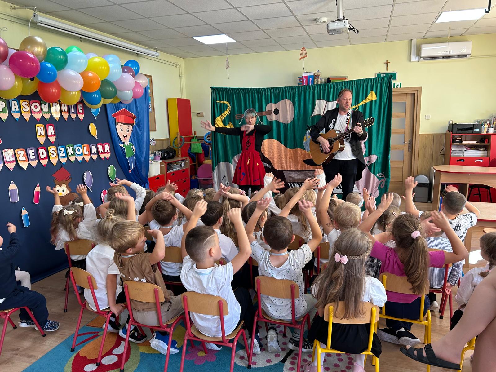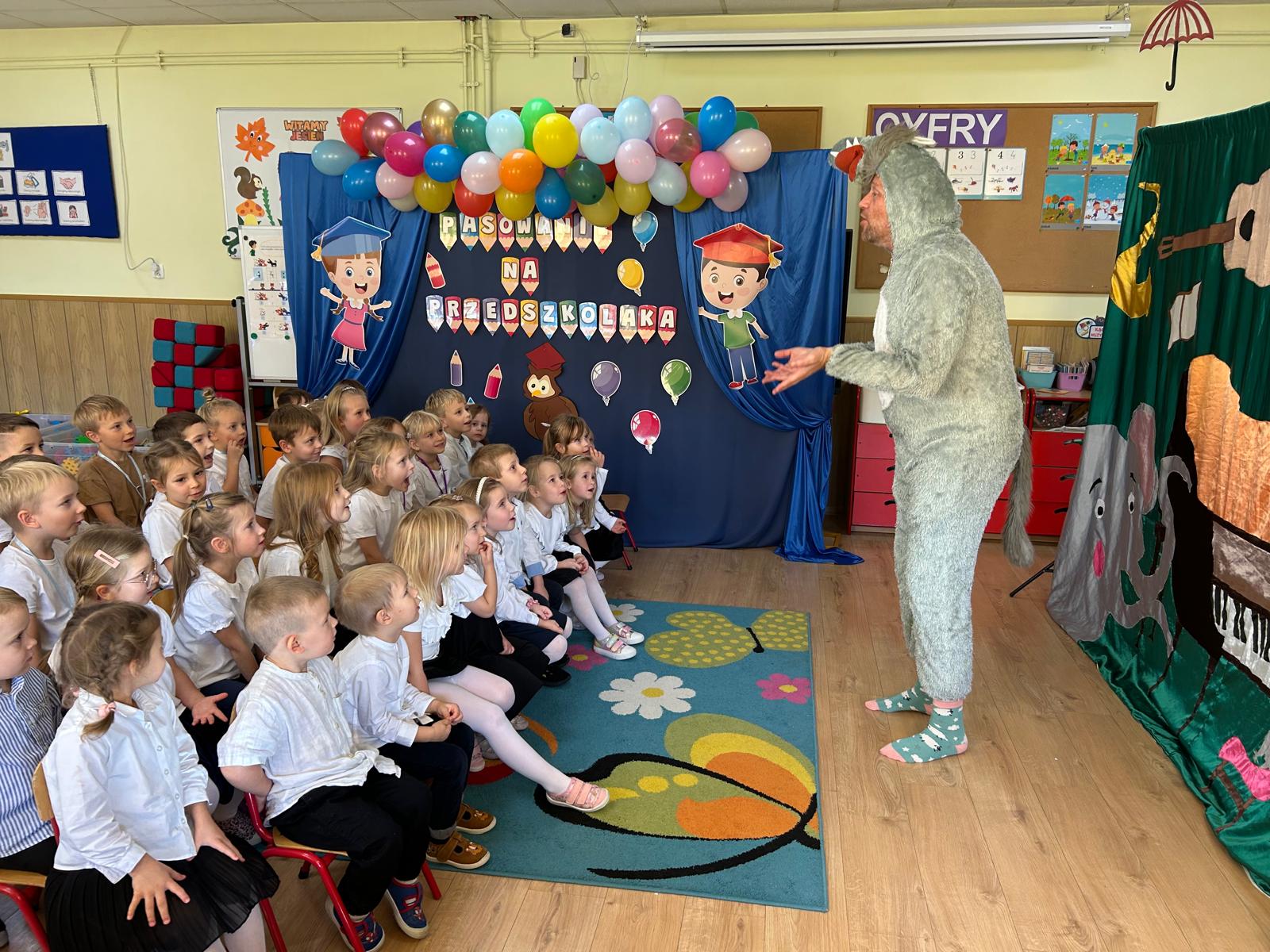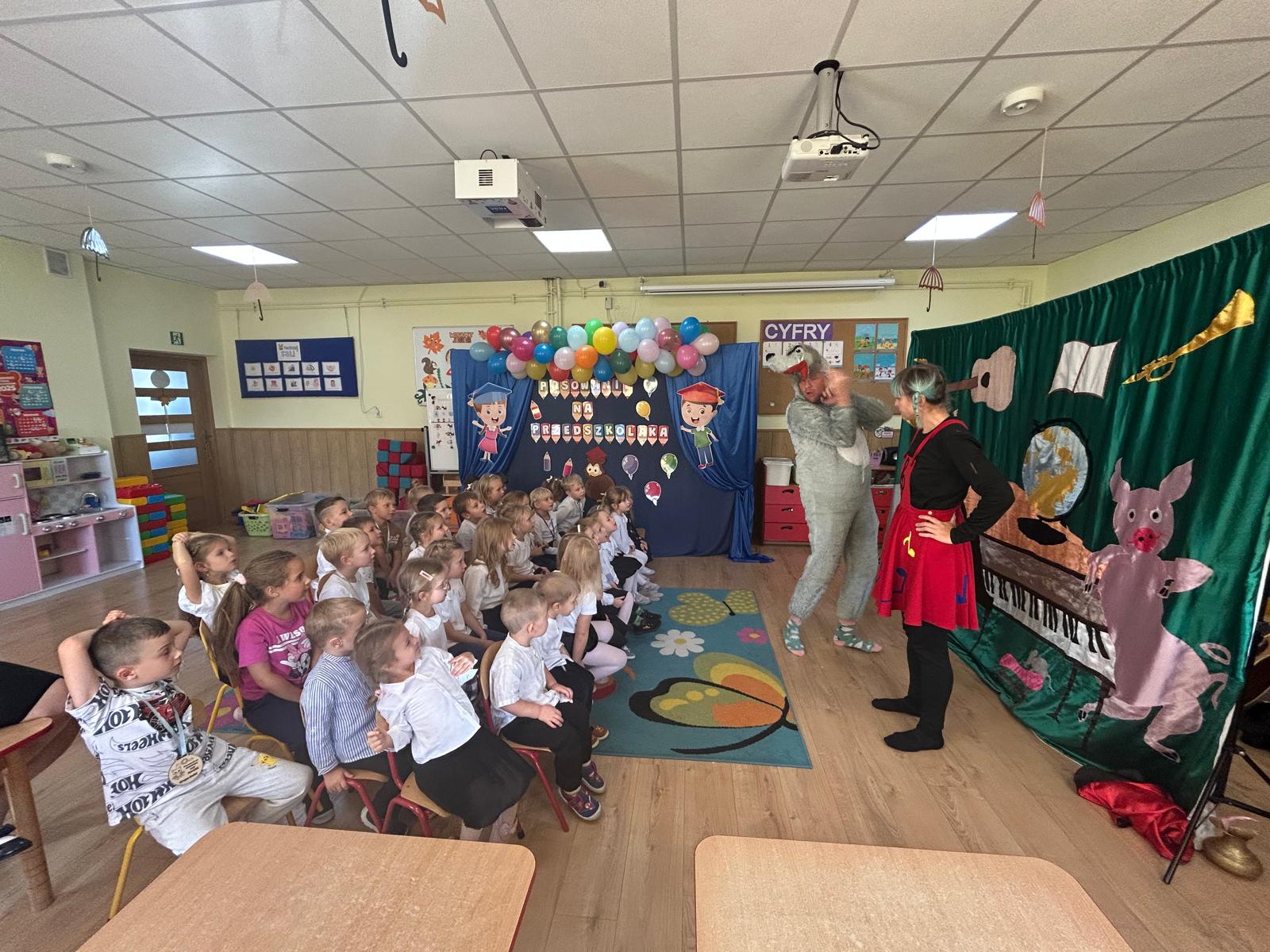 Dziś nasze przedszkole odwiedził teatrzyk „Skrzat”, który zaprezentował dzieciom wspaniały spektakl pt. „Muzyczne podróże po Bajkolandii”. Przedszkolaki z ogromnym zainteresowaniem śledziły przygody bajkowych bohaterów, aktywnie uczestnicząc w muzycznych zabawach i śpiewie. Występ dostarczył wszystkim wiele radości, a kolorowe stroje i wesołe piosenki wprowadziły dzieci w magiczny, bajkowy nastrój.
