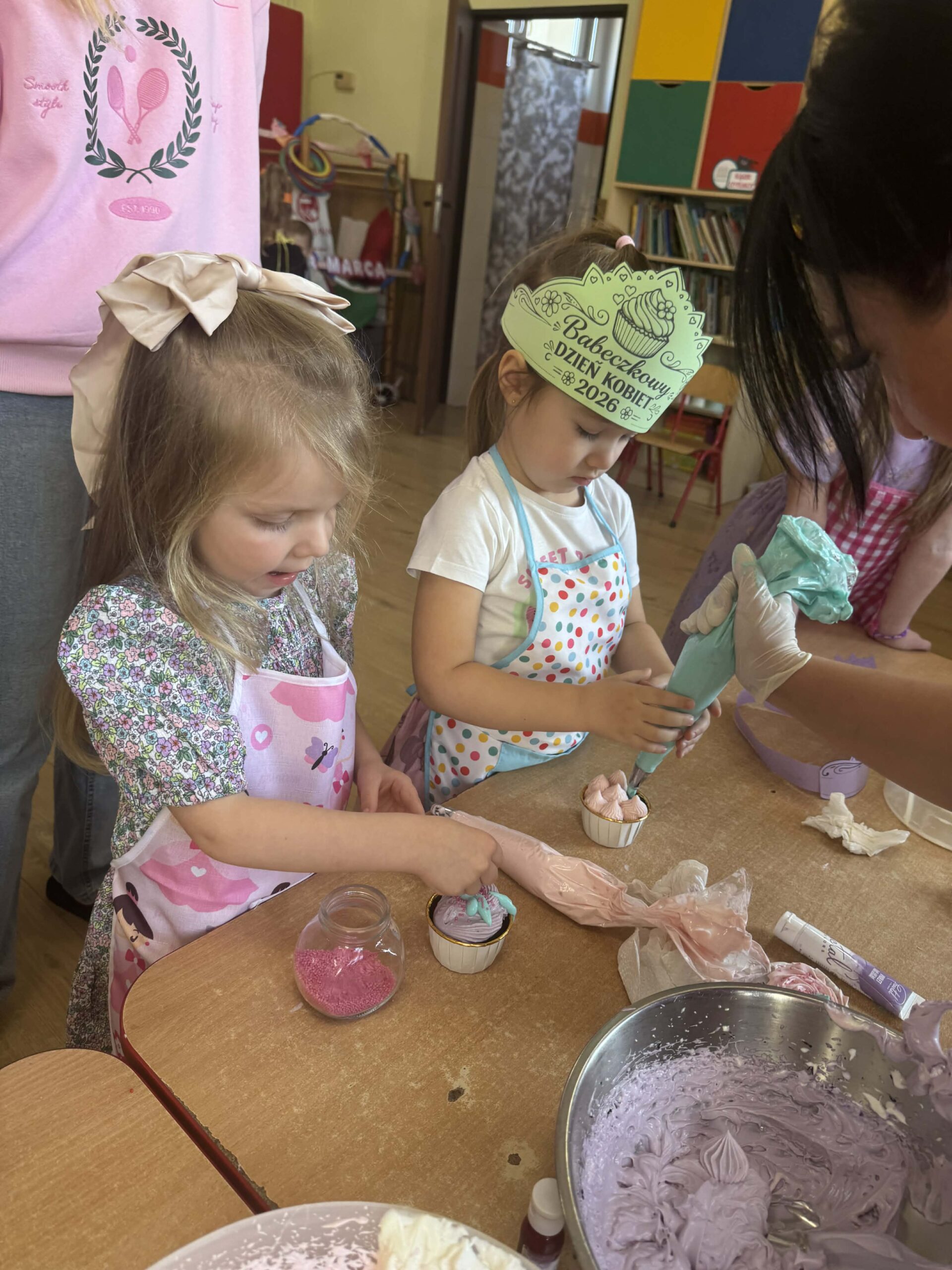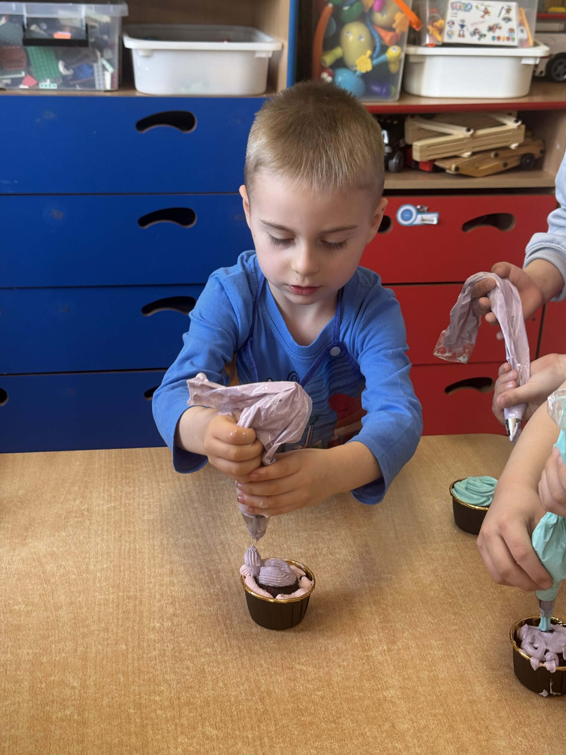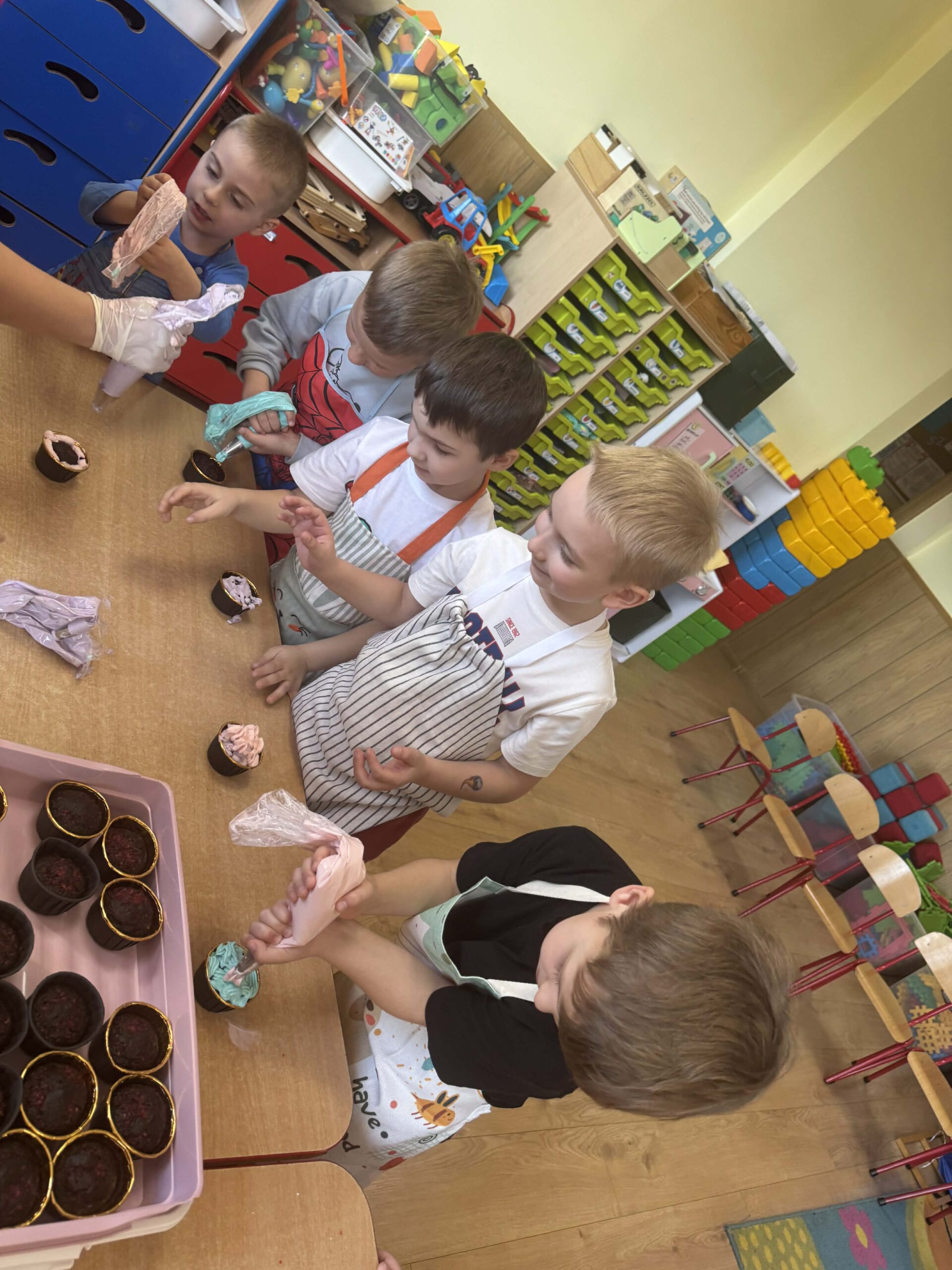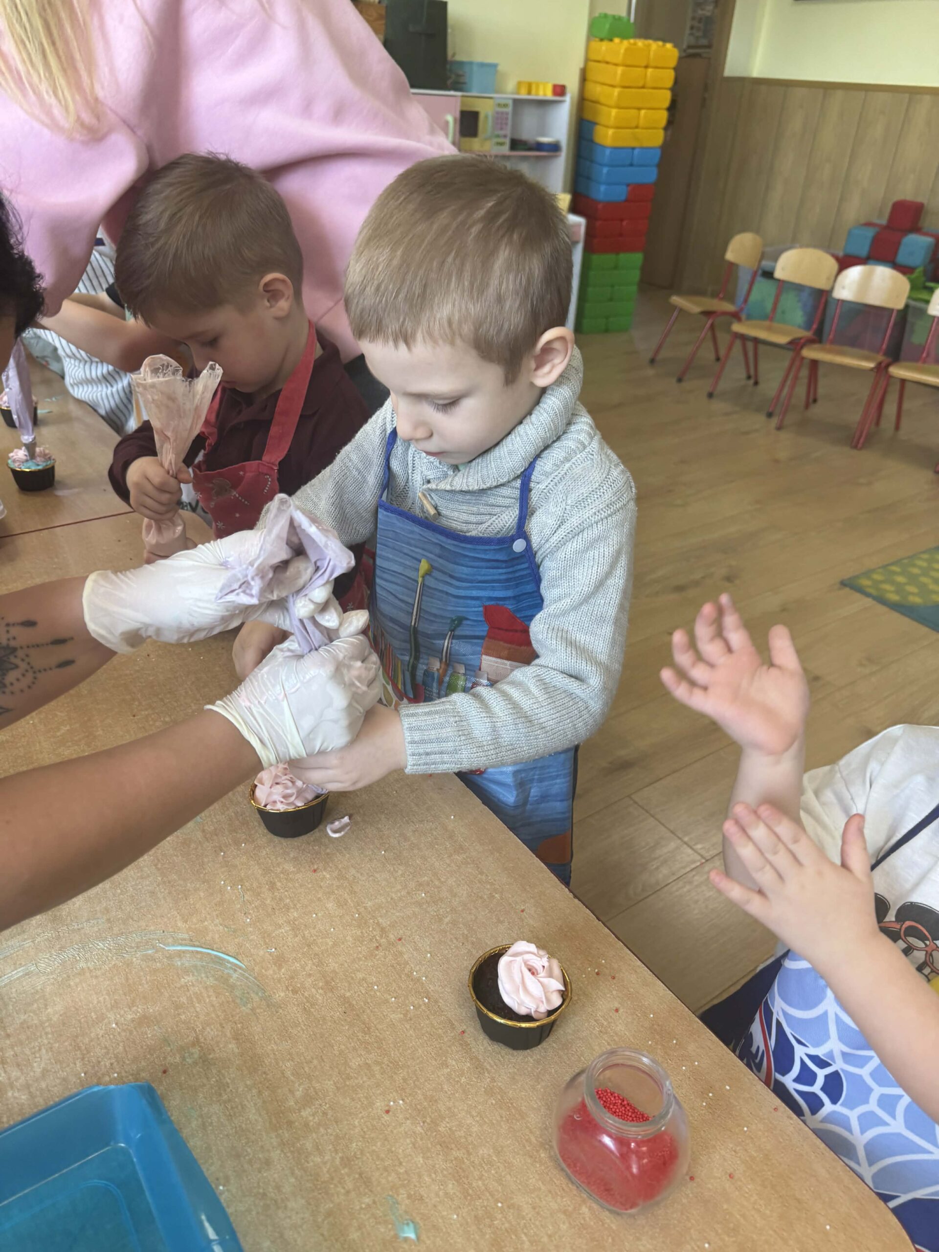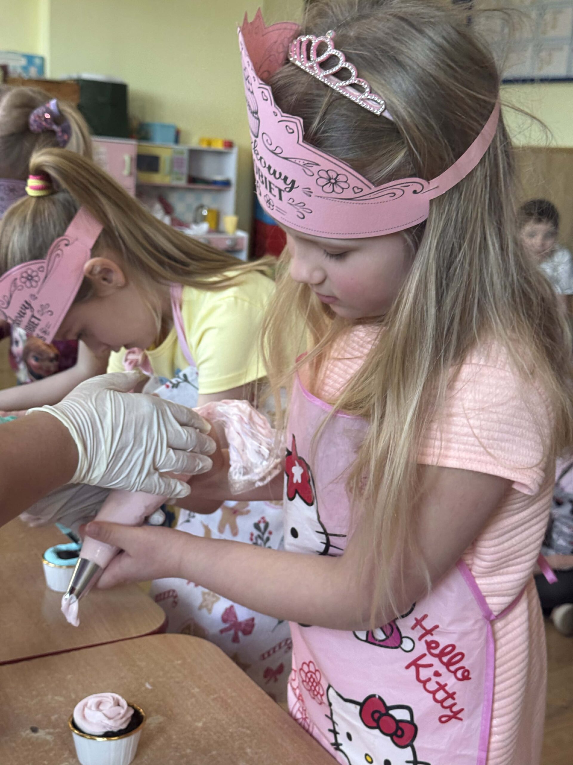 Podczas świętowania dzieci wzięły udział w warsztatach robienia babeczek. Każdy mógł spróbować swoich sił w dekorowaniu – dzieci z wielkim zaangażowaniem ozdabiały babeczki i uczyły się, jak powstają takie słodkie wypieki. Było dużo radości, kreatywności i oczywiście… pysznych smaków! 🧁