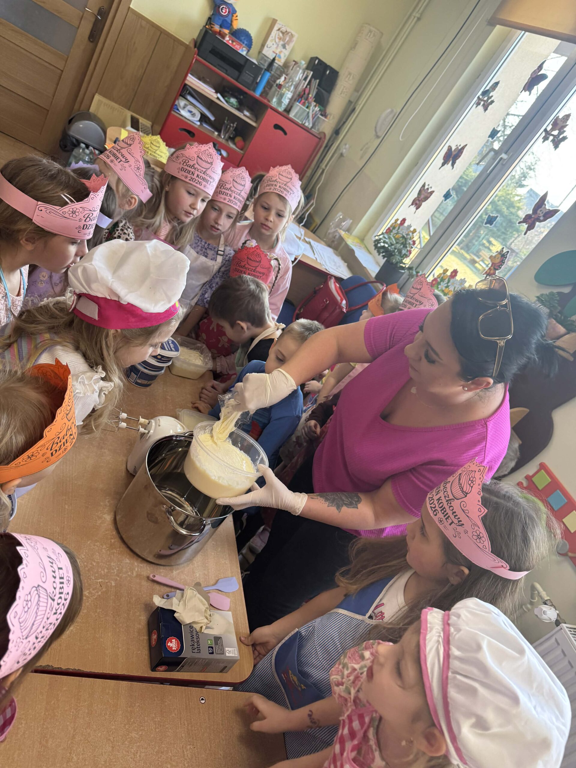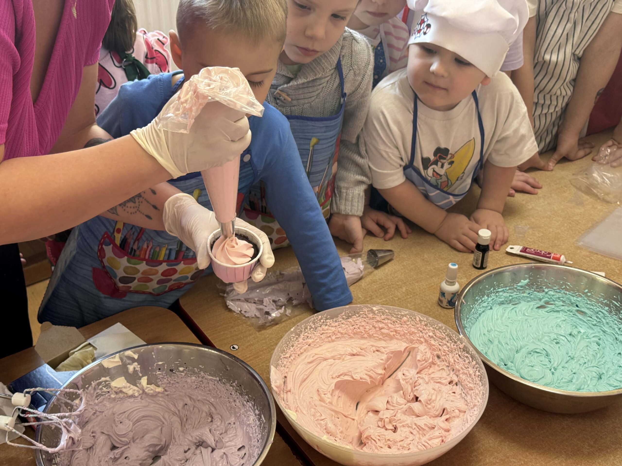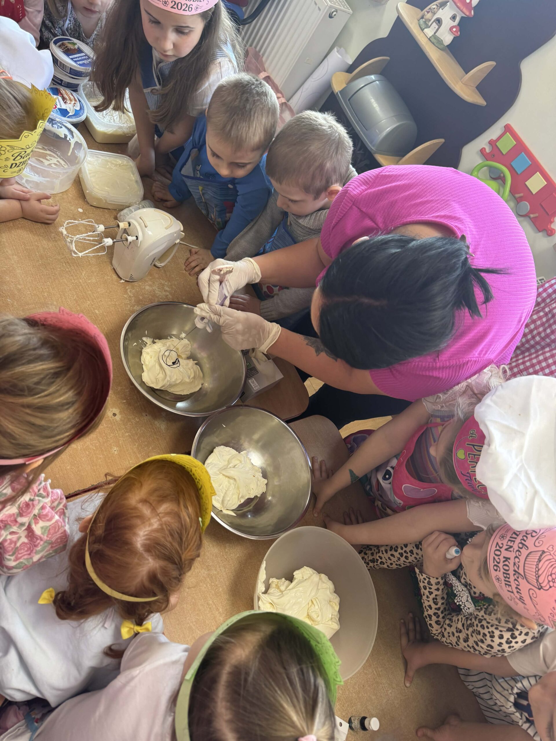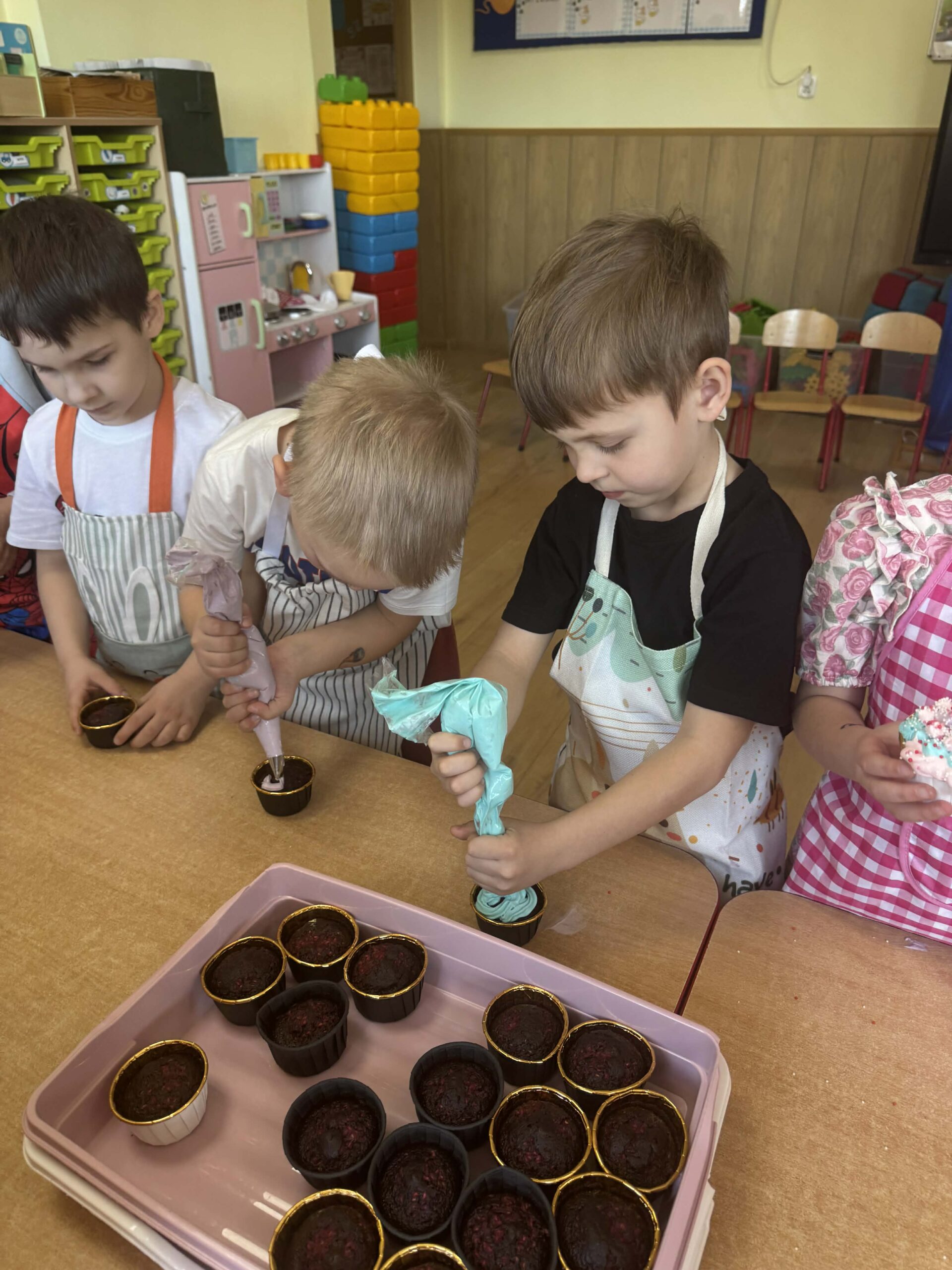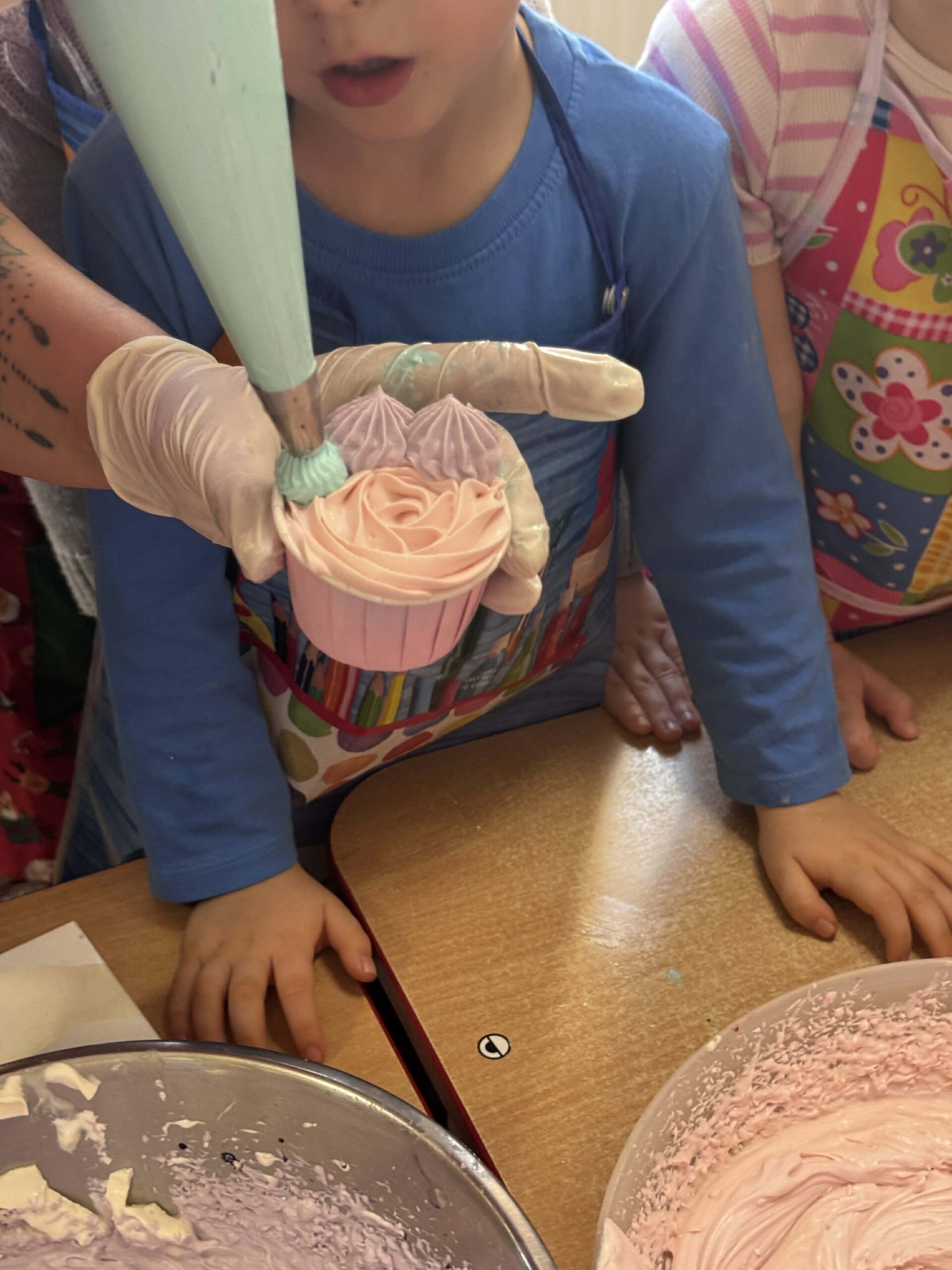 Podczas świętowania dzieci wzięły udział w warsztatach robienia babeczek. Każdy mógł spróbować swoich sił w dekorowaniu – dzieci z wielkim zaangażowaniem ozdabiały babeczki i uczyły się, jak powstają takie słodkie wypieki. Było dużo radości, kreatywności i oczywiście… pysznych smaków! 🧁