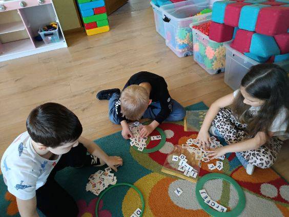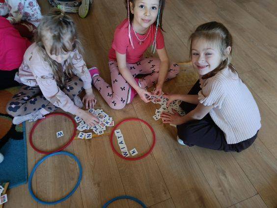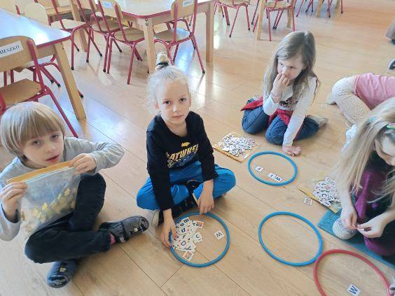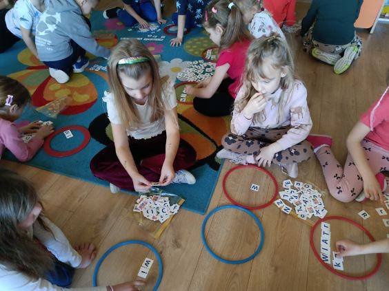 Podczas zajęć dzieci ćwiczyły układanie wyrazów z liter. Pracując w małych grupach, wyszukiwały odpowiednie literki i układały z nich słowa w kolorowych obręczach.