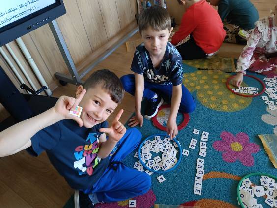 To była świetna okazja do rozwijania umiejętności czytania, spostrzegawczości oraz współpracy z rówieśnikami. Dzieci z dużym zaangażowaniem szukały właściwych liter i wspólnie zastanawiały się, jak poprawnie ułożyć wyrazy.